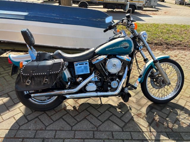 nette wide glide, altijd bij ons in onderhoud geweest, met nw banden etc heel aparte kleur, lang zadel en scherm erbij